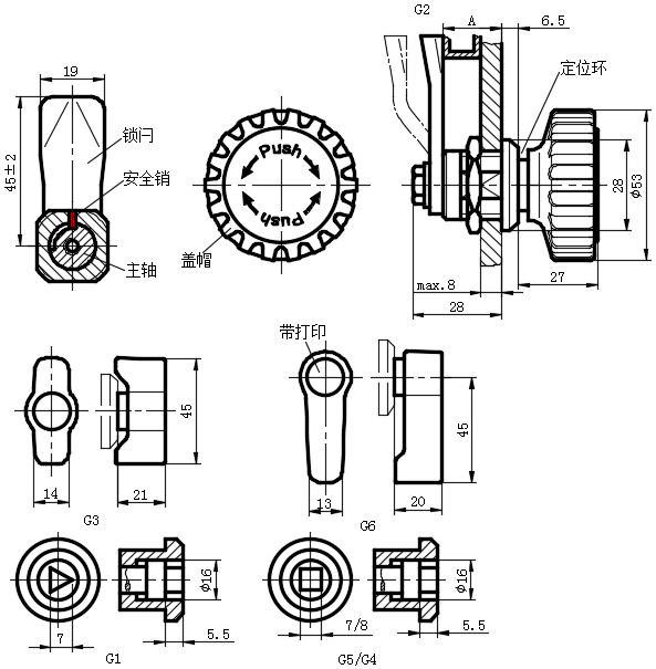 | G2 | 滚花旋钮操作(参见钢镀锌内螺纹滚花旋钮/304不锈钢内螺纹滚花旋钮) | ||