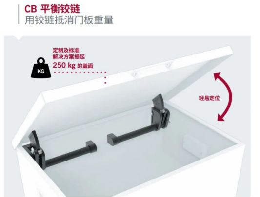 CB 平衡铰链可抵消向下的重力,并在打开和关闭重型门板时提供精确控制,确保门板可以轻松升降,轻而易举的抬起重物且无需额外支撑,降低安全问题。可调节的CB平衡铰链设计紧凑,由于凸起部分极小,可以安装在机柜内,并且可以根据应用的要求精细调节。