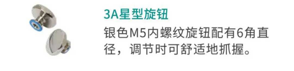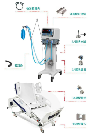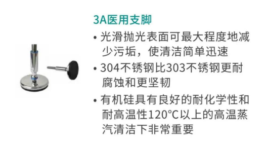 易于清洁、耐化学腐蚀的3A标准产品系列是医疗设备的理想选择。这套支脚、手柄和旋钮均有抛光304不锈钢、硅胶片和光滑表面,以减少灰尘和污垢的堆积。抛光304不锈钢螺母可通过遮蔽螺纹防止空气、灰尘和液体的进入。