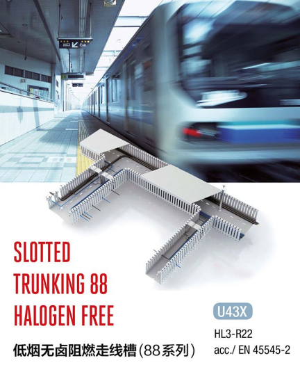 • Unex 88系列走线槽中的U43X(原材料)的已成功通过EN 45545-2: 2013规定的消防安全试验,满足危险等级HL1至HL3的R22-R23(轨交车辆内外)要求。