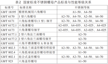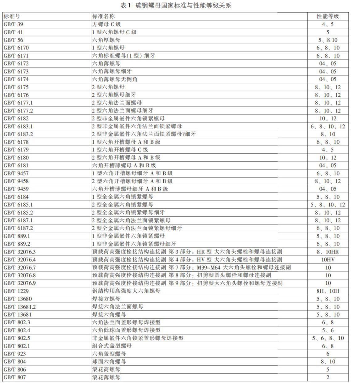 螺母选型除了需要确定材质,其次就是螺母的标准,在确定螺母的标准之前,我们先要确定标准是国家标准还是国外标准又或者是行业标准,通常我们更多会使用国标,所以以下也用国标作为说明:碳钢螺母的标准与等级关系如表1所示,不锈钢螺母的标准与等级如表2所示。